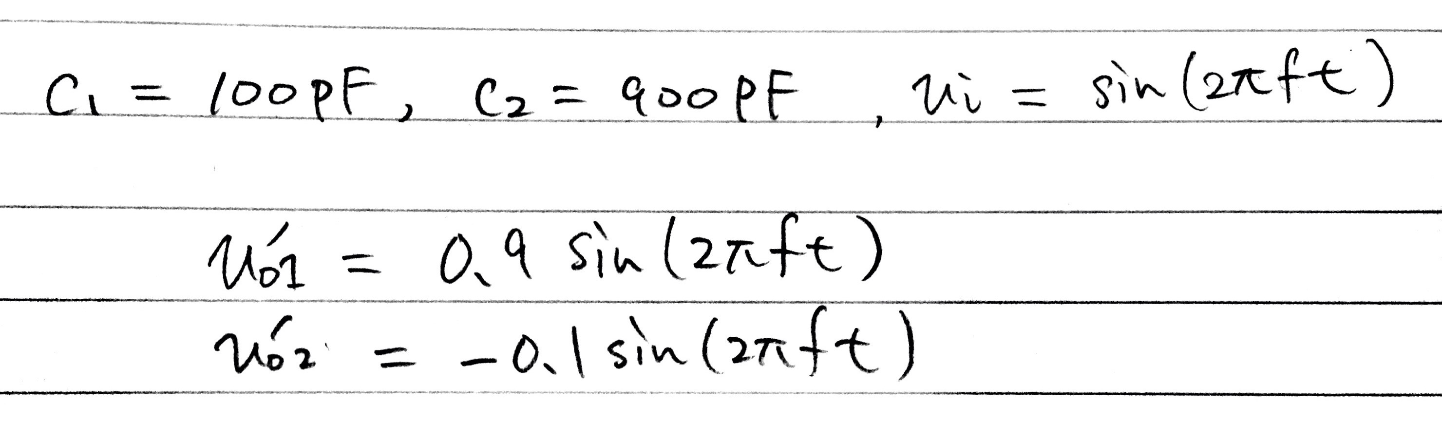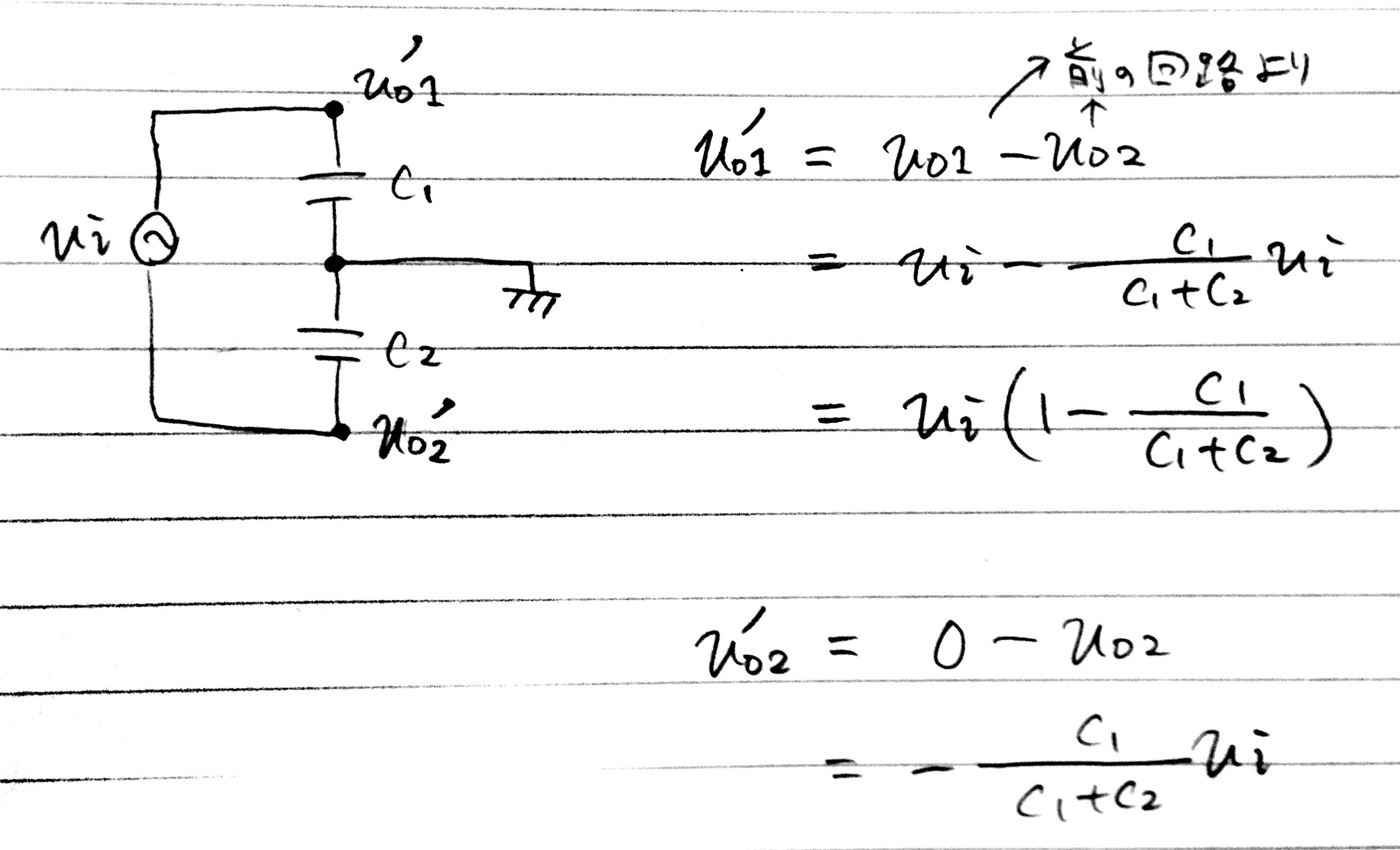 計算結果と一致しています。ここで重要なのは上の結果の通り逆位相の出力がとれるとこです。たとえばC1=C2であれば、出力の振幅は入力の半分となり位相は逆のものが得られます。
