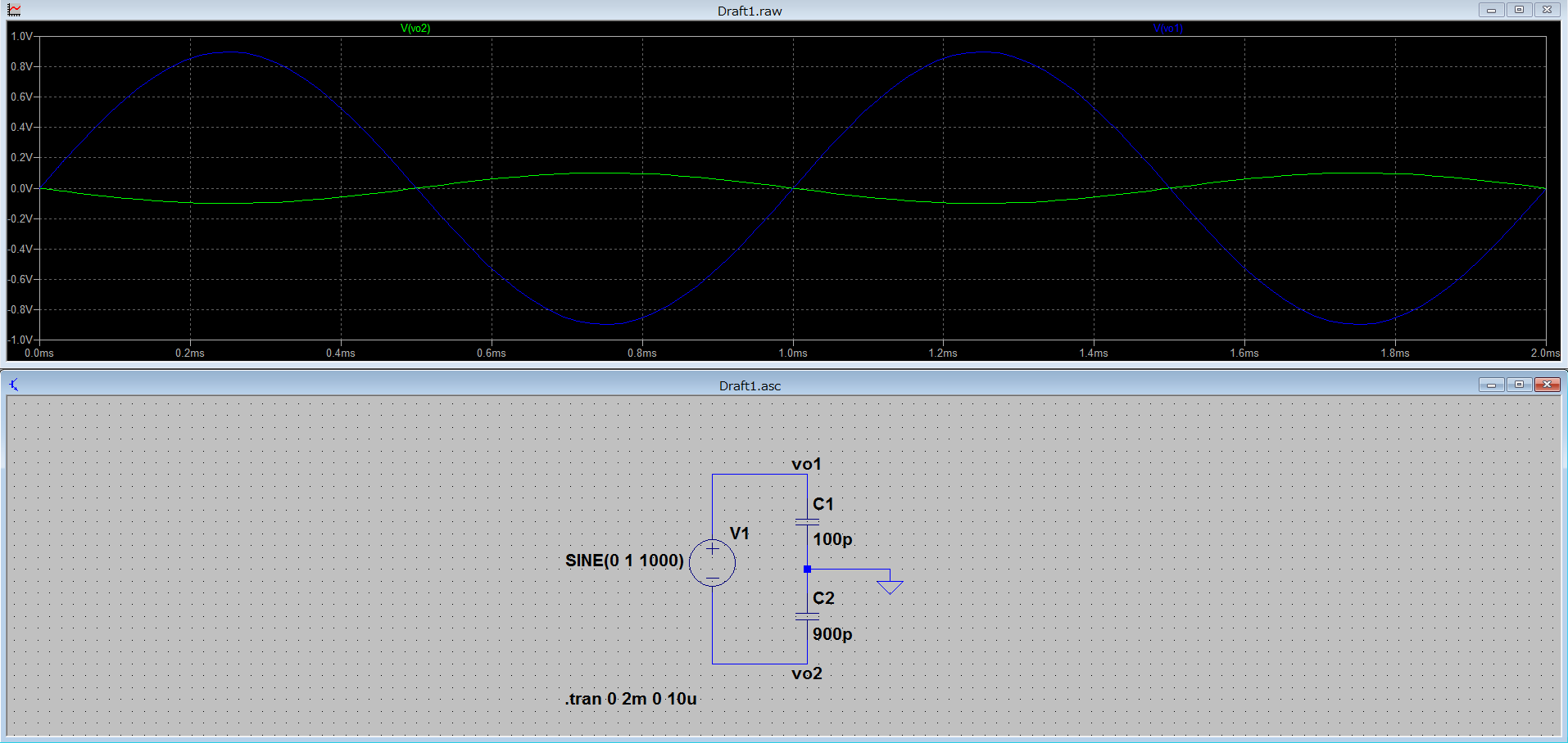 という2点の電圧が得られます。コンデンサの値を適当に決め、入力に1kHzの正弦波を与えてLTspiceでシミュレーションしてみました。