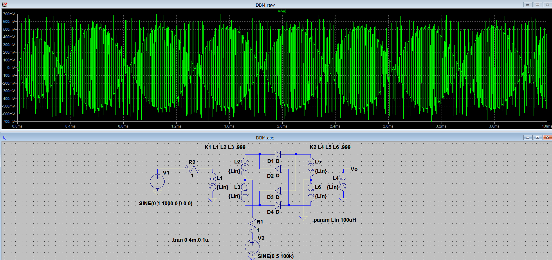 Vs:1kHz Vc:100kHzでやってみた。なお定数は適当。きちんと乗算できているが、「ひげ」がすごい。