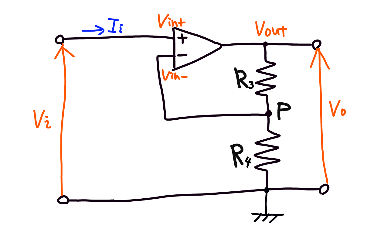 この増幅器は非反転増幅回路というものでそこだけ取り出すと次のような回路です。